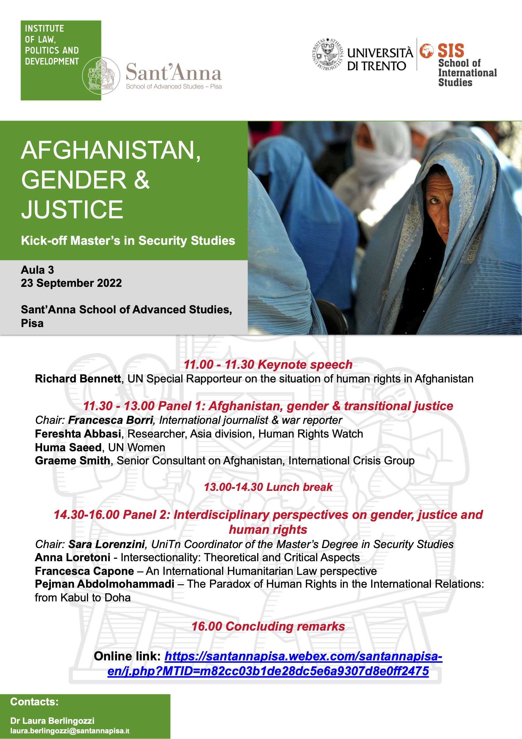 The opening ceremony of the Master’s in International Security Studies offered jointly by the Sant’Anna School of Advanced Studies (SSSA) and the School of International Studies (SIS) of the University of Trento, in the framework of the f the project AFGHAN FUTURES 21 - 5PERMILLE, provides an opportunity for the development of existing expertise while encouraging a critical examination of mainstream approaches to the study of gender and justice. Scholars and practitioners with expertise in politics and security in Afghanistan are invited to engage in a discussion on cross-cutting issues of great relevance for both academic and policy purposes.