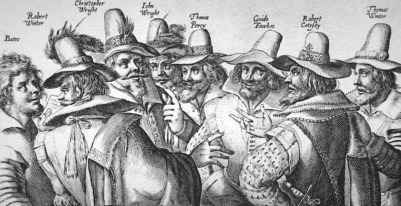 Inline: “Gray hats” in London's 1604, Gunpowder Plot conspirators, engraving by Crispijn van de Passe the Elder - National Portrait Gallery: NPG 334a, wikimedia.org