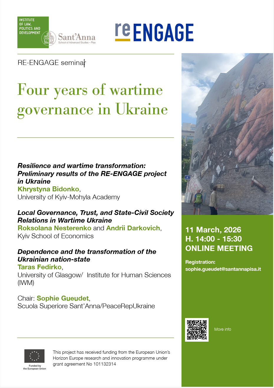 Organised within the framework of the Horizon Europe RE-ENGAGE project, the meeting will bring together scholars from political sociology, political economy, international law, and international relations to examine how four years of full-scale war have reshaped governance, statehood, and society in Ukraine.