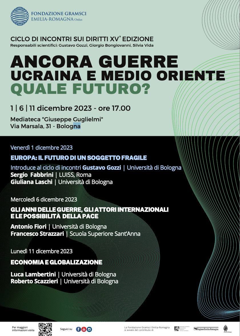 Ciclo di incontri "Ancora guerre, Ucraina e Medio Oriente": seminario "Gli anni delle guerre, gli attori internazionali e le possibilità della pace", mercoledì 6 dicembre 2023, Mediateca "Giuseppe Guglielmi", Fondazione Gramsci Emilia Romagna, Via Marsala 31, Bologna
