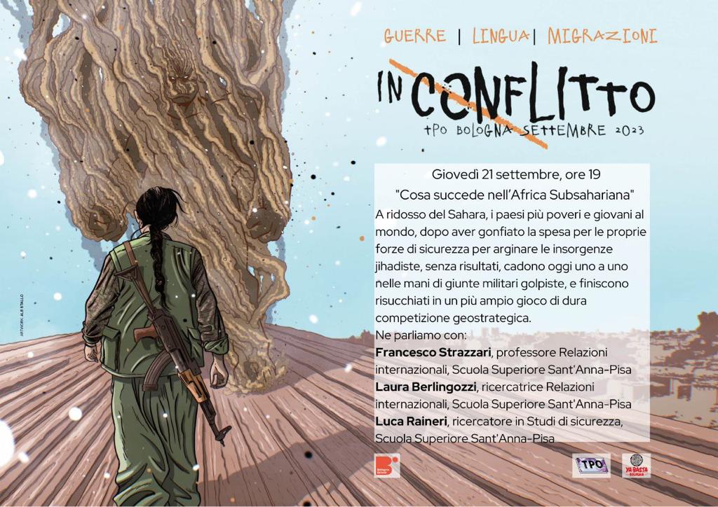 Francesco Strazzari, Laura Berlingozzi, Luca Raineri (Scuola Superiore Sant’Anna, Pisa) saranno relatori ad uno degli incontri organizzati dal centro sociale TPO di Bologna per discutere e problematizzare le diverse forme di conflitto che attraversano le guerre, la lingua e le migrazioni. Il 21 settembre si discuterà di Africa Subsahariana, dei recenti colpi di stato, delle ripercussioni a livello internazionale e sui flussi di persone.