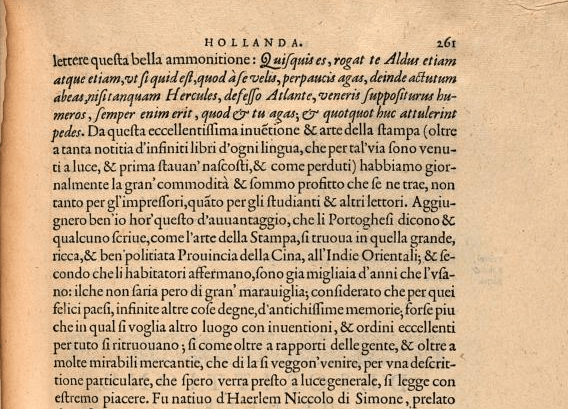 Towards the end of the 16th centurty, Lodovico Guicciardini praises the good, well ordered, government ‘that great, rich, and highly civilized [ben’ politiata] province of China, in the East Indies’ where the art of printing had been in use for a thousand years.[2]