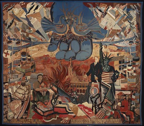 Expressions of support and donations of books and money to Leuven flowed in from around the world, but the most generous gift came from the America who promised to build a new library in Leuven after the war. In gratitude, Belgium offered America an enormous tapestry, done by artist Floris Jespers, one of the most important figures of Belgian avant-garde. The Leuven University Library stands in the centre of the work. On the left, we see the American food aid sent by the Commission for Relief in Belgium (CRB), and in the centre Herbert Hoover, CRB’s chairman, holding in his hands the honorary doctorate bestowed upon him by KU Leuven in 1924. The inscription on the tapestry reads: “The United States saved Belgium from starvation during the war. When peace came they helped to rebuild the country and its scientific institutions.”