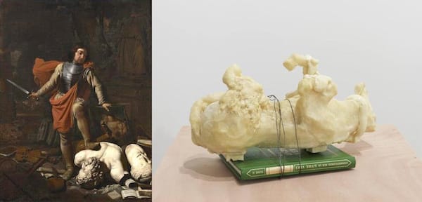The exhibition is divided into five sections or themes, and spans from the 15th century until today. The themes are destroyed cities, ruins, iconoclasm, art and propaganda, and art theft. The painting Mars Destroying the Arts by Michiel Sweerts in the 17th century portraying a remorseless soldier plundering a violin, paintings and sculpture is put side by side with the work of the conceptual artist Adel Abdessemed called Cheval Arabe, a small sculpture from 2011, which points at the close relationship between slaughter and propaganda. This timescape, memoryscape, and aesthetics tension is the main feature of the exhibition.