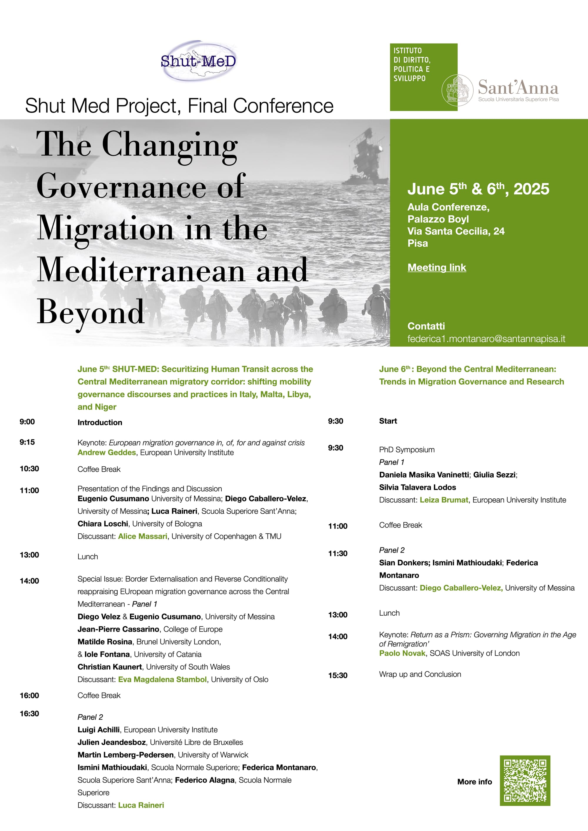 Conference “The Changing Governance of Migration in the Mediterranean and Beyond”, in the framework of the PRIN project SHUT-MED, Sant’Anna School of Advanced Studies, Palazzo Boyl, Pisa, 5-6 June